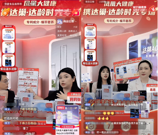 在直播過(guò)程中,直播間互動(dòng)區(qū)始終熱度高漲,觀眾留言提問(wèn)絡(luò)繹不絕,實(shí)時(shí)點(diǎn)贊量持續(xù)攀升,眾多正面反饋刷屏互動(dòng)區(qū),充分彰顯了消費(fèi)者對(duì)達(dá)巢、達(dá)齡系列產(chǎn)品的高度關(guān)注與認(rèn)可。同時(shí)直播間下單量也刷新了鳳凰大健康直播間過(guò)往紀(jì)錄。