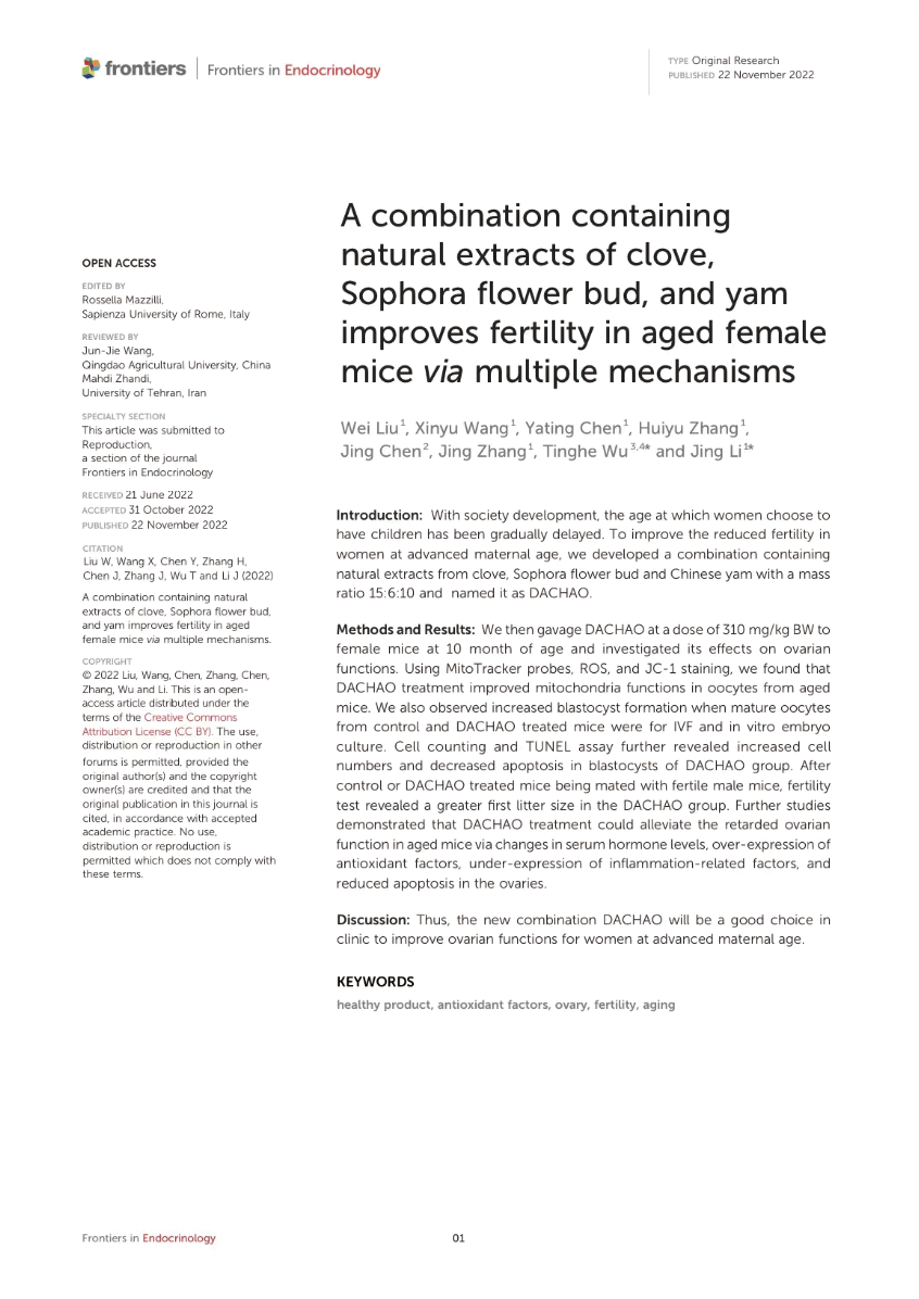 企業(yè)旗下?lián)碛羞_巢、達精、達齡、達愈等多個科研品牌,系列產(chǎn)品達巢Reco18、達精AOS18、達齡Reju28及達愈Reco22等多款產(chǎn)品核心成分均源自植物提取物,部分研究結(jié)論已經(jīng)發(fā)表在影響因子為6.055的知名SCI期刊《Frontiers In Endocrinology》上。目前,系列產(chǎn)品也已在全國超20家三甲機構(gòu)開展臨床課題驗證,部分研究成果已陸續(xù)公布。